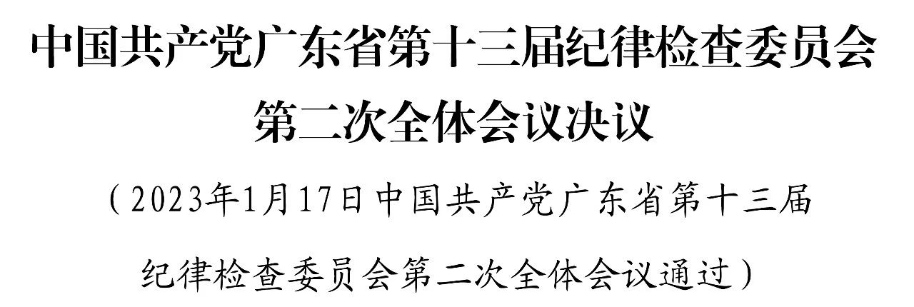 中国共产党广东省第十三届纪律检查委员会第二次全体会议,于2023年1月17日在广州举行。省委书记黄坤明出席全会并讲话,省委副书记、省长王伟中传达了习近平总书记在二十届中央纪委二次全会上的重要讲话和中央纪委二次全会精神。全会审议通过了省委常委、省纪委书记宋福龙代表省纪委常委会所作的《坚定不移深入推进全面从严治党,为广东在全面建设社会主义现代化国家新征程中走在全国前列创造新的辉煌提供政治保障》工作报告。