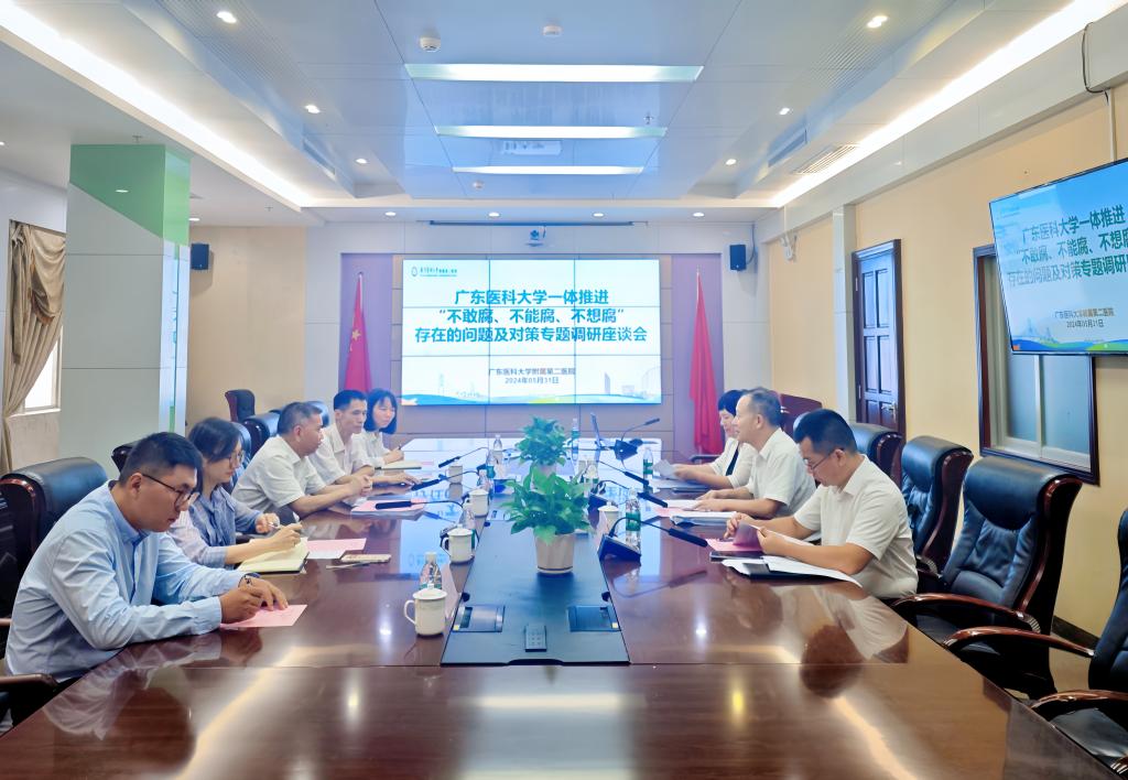 2024年5月31日上午,学校党委副书记、纪委书记、监察专员向献兵率队到附属第二医院开展一体推进“不敢腐、不能腐、不想腐”专题调研座谈会。学校宣传部(教师工作部)副部长冯锦山,伟德国际1946副主任陈丽君及八级职员汤炀炀、白利超,医院党委副书记、院长张良清,党委副书记、纪委书记周宏相,党委副书记罗海燕等参加调研座谈会。